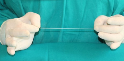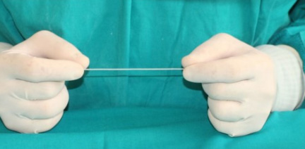관을 빼낸 후 구멍으로 나온 실을 평평한 그물과 함께