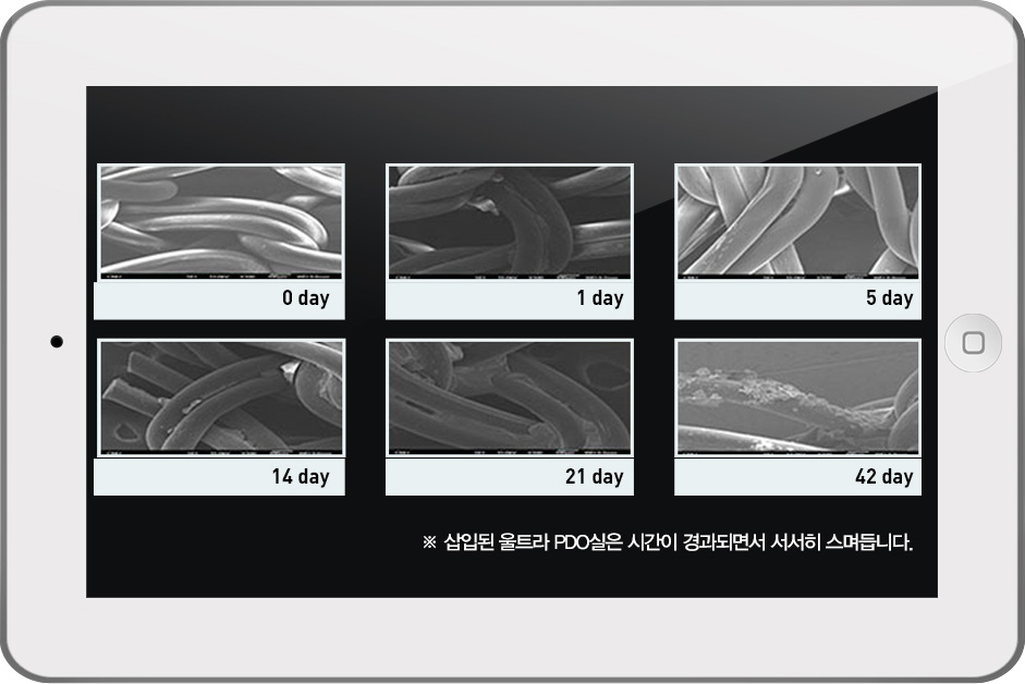 식약청 4등급의 특수한 돌기가 있는 녹는실(PDO)를 이용하여 피부 속에서 천천히 스며들어 시간이 지날 수록 만족감을 느낄 수 있는 시술입니다.
