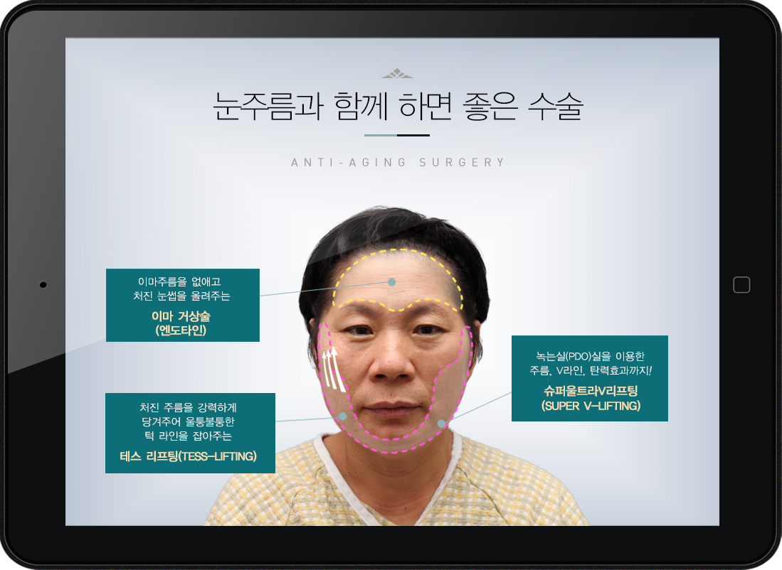 이러한 눈꺼풀은 시야를 방해하기도 하고 이마, 미간 등을 찌푸림으로써 얼굴 전체를 더 나이들어 보이게 합니다. 피부 처짐의
