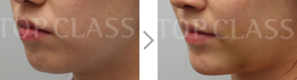Surgery is carried out under general anesthesia. Horizontal osteotomy is carried out through incision inside the mouth. According to the degree of the short chin, the tip of the chin is moved forward and fixed using titanium plate.