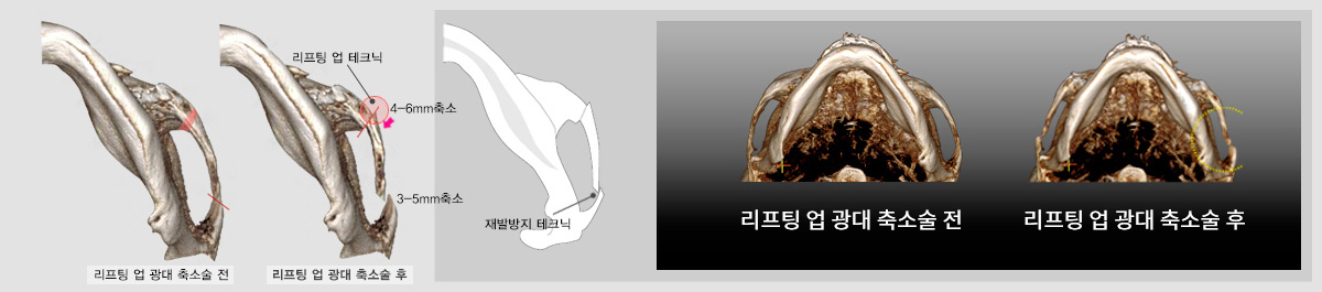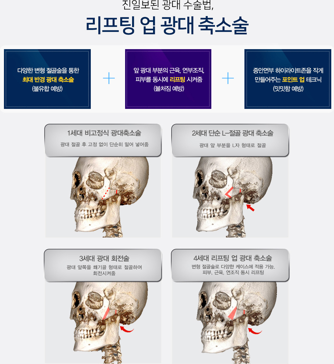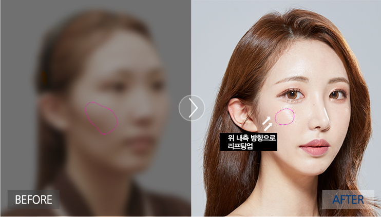단순 축소술은 볼처짐 불유합, 밋밋함으로 인해 불만족스러운 결과가 생길 확률이 높습니다. 탑클래스성형외과에서는 앞광대 부분의 근육, 연부조직, 피부를 리프팅 시켜주고 중앙면부