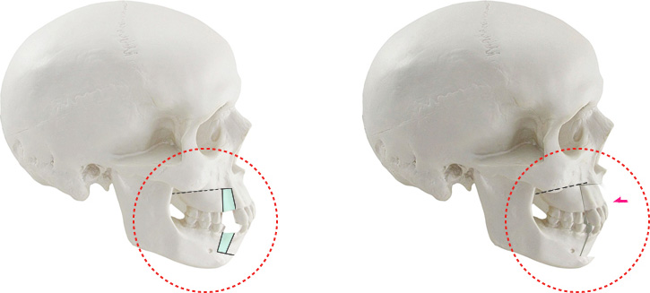 | 교근과 측두근 회복이 빠르며, 관절돌기와 하악와 간의 간격 변동이 적다(턱관절 무리가 적다) | 하 차조신경의 손상이나 압박으로 아랫입술 감각이 일시적으로 떨어질 수 있다. |
